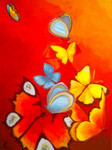 2005een vrouw in een jurk van vlinders in vrolijke warme kleuren op een rode achtergrond