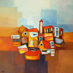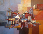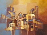 abstracte schilderijen van acryl met allerlei materialen die uiting geven aan de nostalgie en vergane tijden van steden of landschap