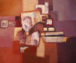 2007abstract in warme kleuren paars en bruin met verwijzing naar oude gebouwen, acryl met papier op doek